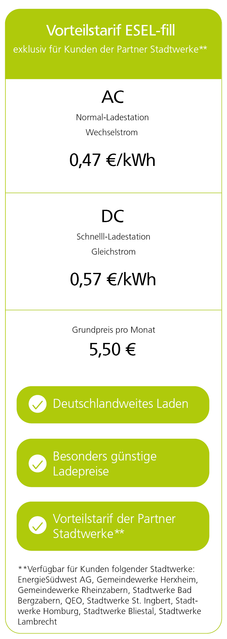 Mit der ESEL-Verbundkarte laden Sie im öffentlichen Ladenetz der EnergieSüdwest in Landau und den umliegenden Gemeinden überall zum gleichen Preis. Nutzen Sie den Vorteilstarif für dauerhaft günstiges Laden vor Ort.